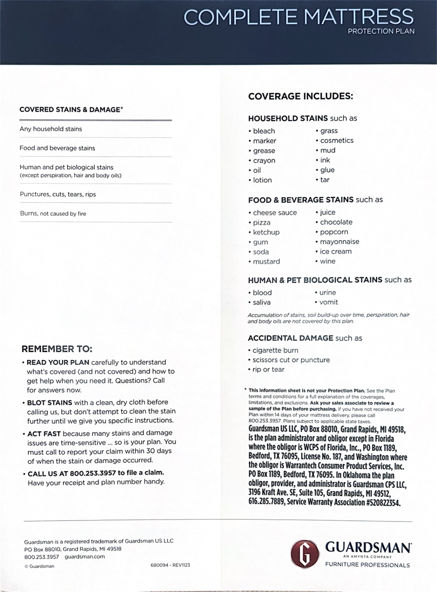 The Guardsman Complete Mattress Protection Plan is a service plan that helps protect your mattress investment by covering accidental stains and damages not covered by standard warranties.